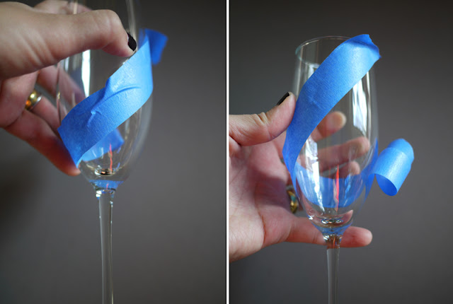 Rip off a 6 inch piece of tape. Center the tape over the base of the glassware, rubbing the bottom edge against the glass. Pull the sides up at a slight angle. As long as the bottom edge